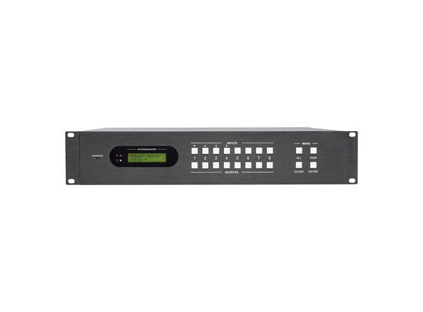 Speaking of management: the control functions are executed directly via push-buttons and display on the device or by means of the infrared remote control. Alternatively you can use the supplied PC software or existing media controllers via RS232 or ethernet (TCP/IP). Moreover, the integrated EDID management ensures a fast and stressless setup.