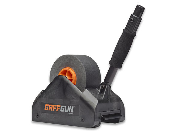 And this is how it’s done: Insert the desired guide (e.g. GAFF-CG-S) from below into the GAFFGUN, press on and let click into place. Push in the original GAFFGUN CoreLok tape laterally along the orange axis with the gap groove (in the tape core) over the lock-in catch of the axis and fix until it clicks. Pull the tape end through the opening at the bottom over the guide pulley to the edge of the housing. The GAFFGUN is now “loaded“. Stick the tape end at the desired “starting point“ and mount the GAFFGUN. During the Go&Roll process lightly push against the bottom side with the handle. Finally cut off the tape at the tear-off plate of the GAFFGUN. The extendable handle can be loosened by turning it counterclockwise and extended or retracted at the desired height. (Turning it clockwise fixes the height). Enjoy “shooting“ with the (r)evolutionary GAFFGUN!