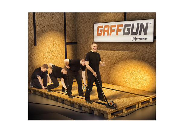 With the new GAFFGUN the troublesome crawling on the floor to fix cables with tape to the floor will be over. With up to 6 audio or video cables strayed on the floor you can easily have a relaxed walk and the GAFFGUN will center and lock the cables into position and fix them with quality tape to the floor; or just simply put down warning or dancefloor tapes and more!