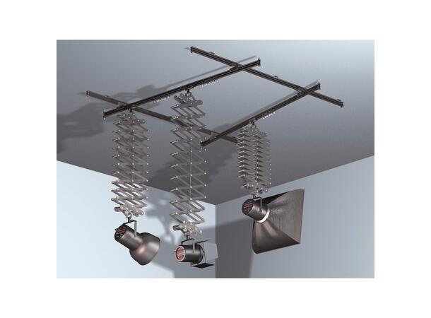 Complete kit for medium-sized studios composed of 2 fixed rails 4m long, 2 mobile rails 3m long and supports for 3 light sources (3 Top Pantographs).