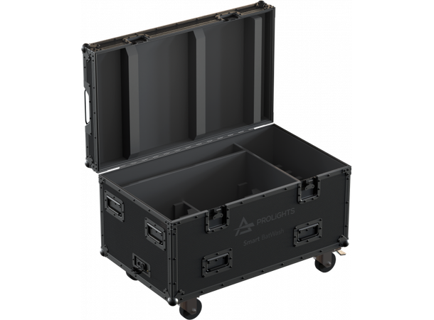 Flight case with internal compartments, 4 rotating wheels, with internal AC battery charging designed to contain 4 SMARTBATPLUSWASH.