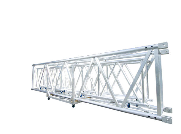 The M145RV Mammoth truss is constructed of main chords (100 x 8 mm) and diagonal members (60 x 60 x 3,5 mm and 50 x 4 mm). The M145RV truss is equipped with a smart, orientation free, pin-fork type connection and is fast and easy to assemble. The M145RV truss is developed for special applications where extreme loads or circumstances require massive strength; it can be used as mast section in combination with tower systems or as span in combination with the D75 truss. Due to its 4-sided webbing the D75 truss can absorb vertical as well as horizontal loads, which make sit ideal for outdoor or 3 dimensional structures. Spans up to 30 metres are no challenge for this truss. Other truss types can be stored inside the M145RV
