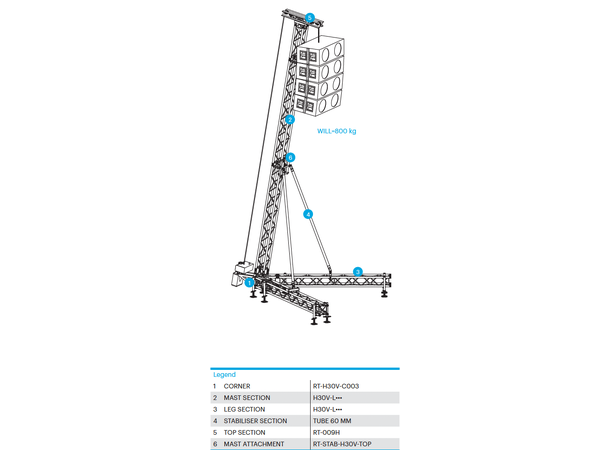 The light-duty RT-H30V has a loading capacity of 800 kg and amaximum lifting height of 7,60 m. The RT H30V is based on H30Vtruss with stabilisers of 60 mm tube. It has a self-weight of 260kg. The legs of the V-shaped base can be levelled by means ofscrew jacks, which are attached to the side of the legs.After the base is placed, the mast can be build and erected usingthe hinges on the base corner. The mast should be stabilised bymeans of the braces, which fix to the legs. After the system islevelled and ballast is applied, the load can be hoisted in position.Its relatively small dimensions make it suitable for a range ofapplications, including outdoor events, concerts, shoppingmalls, halls, exhibition areas and theme parks.